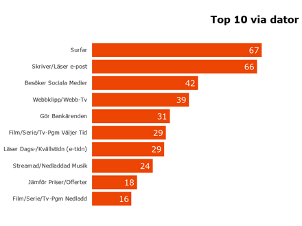 Även tidsåtgången fortsätter att öka på konsumtion av internet via olika plattformar. Sett på hela riket lägger man i genomsnitt 59 minuter/dag på internet via dator, 15 minuter på internet via surfplatta och 29 minuter på internet via mobil. I åldersgruppen 16-25 år läggs i genomsnitt 107 minuter/dag på internet via en dator, 73 minuter/dag på internet via mobilen och19 minuter/dag via en surfplatta.