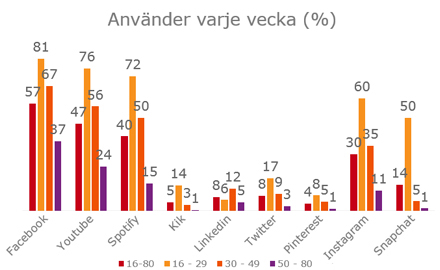 Tittar man på åldersgruppen 16-29 år använder 81 % Facebook och 60 % Instagram varje vecka.
