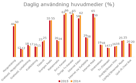 Enligt ORVESTO® Konsument 2015:2 läser totalt 46 % av det svenska folket en morgontidning en genomsnittlig dag, och läsandet av morgontidningen sker i snitt 13 minuter per dag. Jämfört med motsvarande mätning för ett år sedan (2014:2) har läsning av morgontidning minskat med 4 procentenheter.