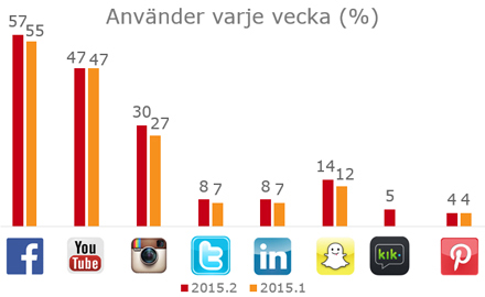 Användningen av sociala medier ökar jämfört med 2015:1-mätningen. 57 % av den undersökta populationen använder Facebook minst en gång per vecka och Instagram är nu uppe på 30 %.