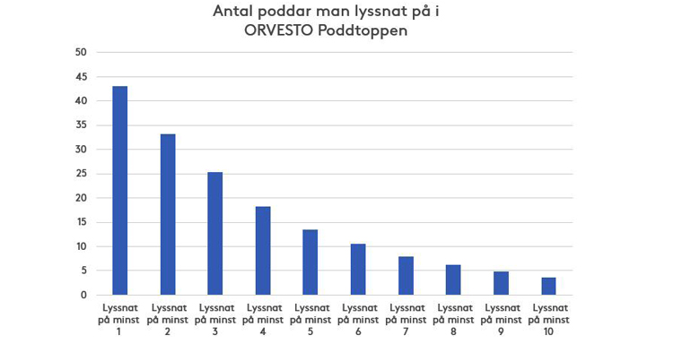 Posten ”övriga poddar” ökar för varje delmätning vilket indikerar en allt mer fragmenterad marknad och att fler människor lyssnar på poddar. Intressant är också att se hur många olika poddar (av de som vi frågat om) som man lyssnar på någon gång under ett år. 25 % lyssnar på minst 3 av poddarna som mäts, 13,5 % lyssnar på minst 5 av poddarna som mäts och 3,5 % lyssnar på hela 10 av de poddar vi mäter.