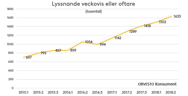 Sedan 2015 har vi kunnat följa en stadig ökning av podcastmarknadens utveckling i ORVESTO Konsument. Och ökningen av det generella lyssnandet på poddar fortsätter. Jämför vi utvecklingen 2018:2 med förra mätningen (2018:1) ser vi en ökning på strax under 9 % på veckolyssning. Tittar vi på veckolyssnandet för ett år sedan (2017:2) ser vi en mer betydande ökning på 27 %.