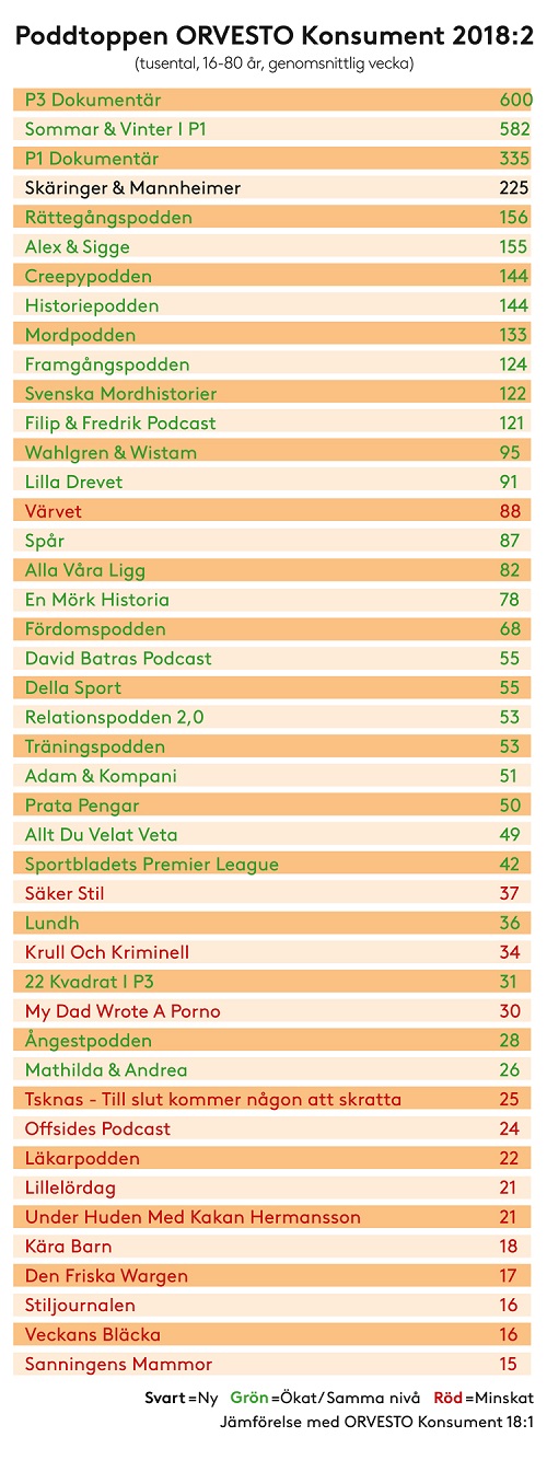 Förutom de välkända formaten från Sveriges Radio kan vi fortfarande se trenden inom teman crime, historia och livsstil som ligger högt upp på listan över svenskarnas poddfavoriter. Poddarna med intervjuformat som Framgångspodden har ökat stadigt de senaste mätningarna samtidigt som Värvet i liknande format som sagt har tappat något i denna mätning. Livsstilspoddarna Alex & Sigge, Filip & Fredrik och Wahlgren & Wistam är fortfarande omåttligt populära.