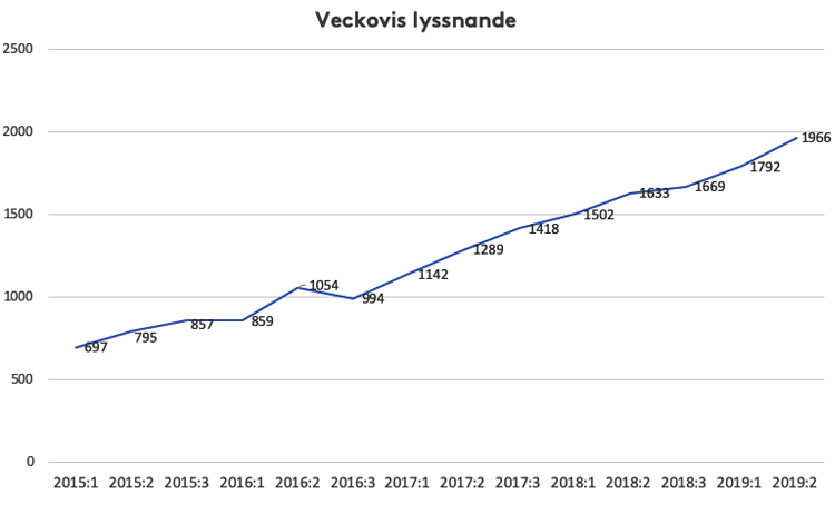 Sedan 2015 har vi kunnat följa en stadig ökning av podcastmarknadens utveckling i ORVESTO Konsument. Och ökningen av det generella lyssnandet på poddar fortsätter stadigt uppåt. Jämför vi utvecklingen 2019:2 med förra mätningen (2019:1) ser vi en ökning på strax under 9 % på veckolyssning. Tittar vi på veckolyssnandet för ett år sedan (2018:2) ser vi en mer betydande ökning på 24 %. 1 966 000 människor eller 25 % mellan 16-80 år lyssnade på podcast under en genomsnittlig vecka under sommaren.