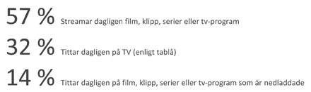Att titta på film, klipp, serier och tv-program vid den tidpunkt det passar just mig blir ett allt vanligare beteende, och är idag bara ett knapptryck bort. Streamade filmtjänster och video on demand-tjänsterna blir också allt fler. Varje dag tittar 57 % av barnen 7-15 år på film, klipp, serier och tv-program på nätet via några nämnda plattformar ovan (netto). 32 % tittar på tv-program på sändningstiden varje dag. Att ladda ner film/klipp/serier eller tv-program från nätet är dock inte lika vanligt förekommande i yngre målgrupper.